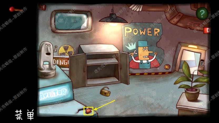12. 在下面火炉右边的拉杆输入密码,进入大楼,我们先在地上拿到日记,用铲子从花盆里拿到锯子,再把柜子上的锁锯掉,拿到操作杆。