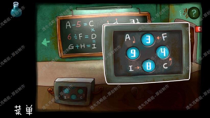 7. 当看到机器人想要邮票时,先别理会,继续朝右走。这时会看到黑板上有一道数学题,通过推算得出密码(1 - 9中,墙上已有5和6,所以是七个数字),结果为A = 9、C = 4、D = 2、I = 8、F = 3、G = 1、H = 7 。将这些数值填入下方装置,下方通道会打开,但此时不要进去。