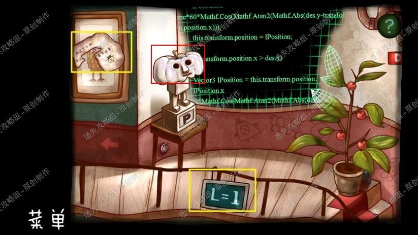 14. 在机器人嘴里的纸条上我们获得密码V=7,继续向右,把雕塑的头拿下来,在苹果树这里获得密码L=1和记忆碎片,下楼。