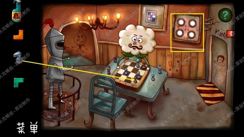 9. 在通道里输出密码9000,用洗洁精擦掉图案,获得提示A4B4C2D1,回到棋盘那里,找到对应棋子,记住他们的样子。