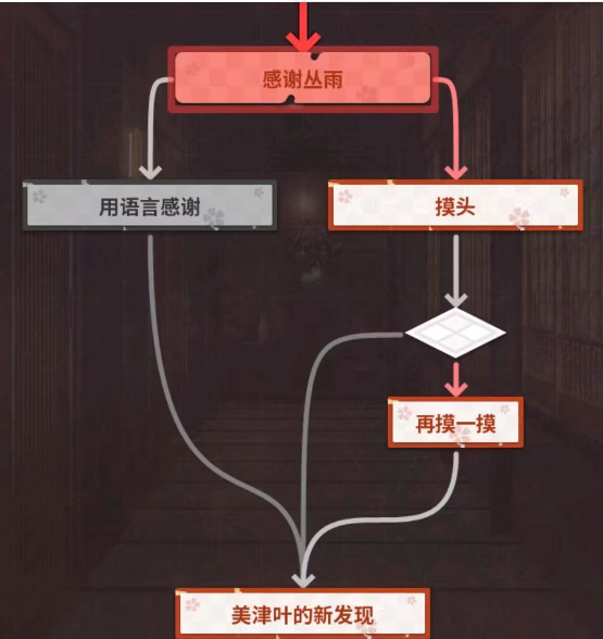 上图中“再摸一摸”这一情节,是进入丛雨线时共通线所特有的剧情。倘若在第4个决定性选项“接下来要干什么”里,没有选取“单独行动”,那么这时丛雨的好感度为1 ,在此之后即便选择了“摸头”,也不会触发“再摸一摸”的剧情。