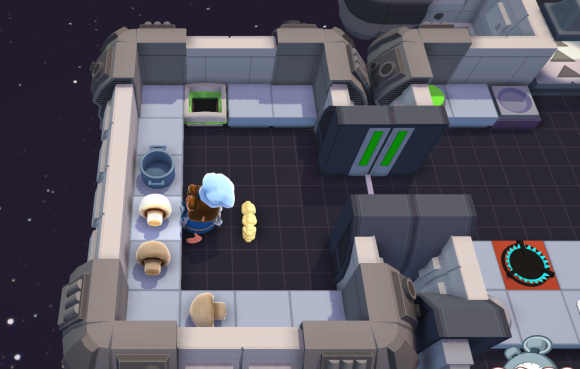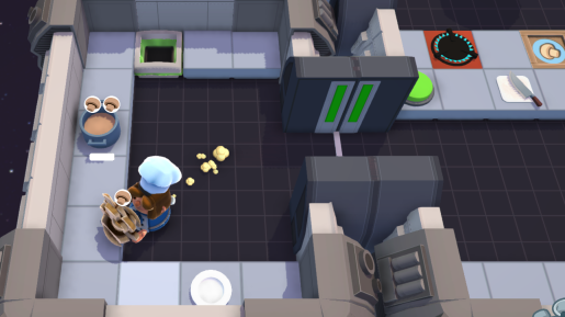 主要流程为:首先,上方的chef在移动机舱内安装好三个原材料与汤锅,接着将移动机舱传送下去。下方的chef收到后便开始切菜,而在下方chef切菜的这段时间里,上方的chef利用间隙着手装配下一个移动机舱。因为装配所花费的时间比切菜短,所以通常是上方的chef把移动机舱传下去之后,才会收到下方传来已完成切菜的机舱,然后进行炖煮操作。后续皆按此流程类推。当完成三道菜后,上方的chef在完成原材料装配的空闲时段,需要及时清洗脏盘子。
