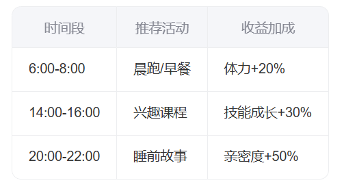 每日需依次完成饮食供给(早餐/午餐/晚餐各1次)、睡眠安排(每晚21:00前)、学习辅导(每日2课时)三项基础指标。
