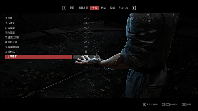 2、在选项的音频栏目最下方的音频语言里,选择“汉语”,就能在游戏中开启中文配音。