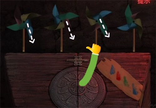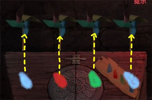 举个例子,以木棍作为参照点,依据纸条上颜色的规定,进行调整,从而让每个风车相应颜色的风车叶都能够同步经过参照点。