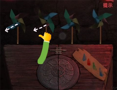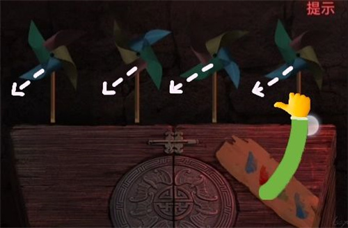 ②用手按住第二个风车,同时留意第一个风车。当第一个风车的蓝色叶片快要转到与第二个风车红色叶片相同位置的时候,松开按住第二个风车的手。
