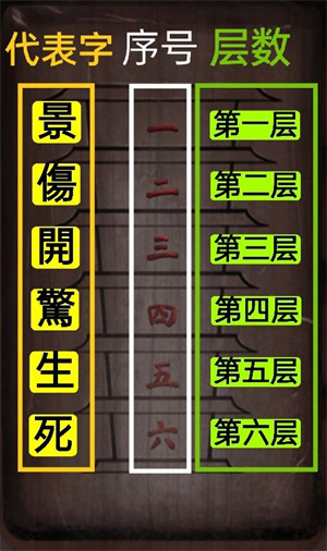 对应代表字“ 景-傷-開-驚-生-死 ”