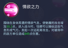 情欲之力:魅魔周身环绕着情欲气息,这股气息令其攻击力提升52.2点。当进入战斗时,恬娜(魅魔)能够操控这些气息凝聚成气刃,发动一次远距离攻击,对命中的敌方单位造成1191点伤害。(伤害数值会随军团等级、进阶以及升星情况按比例增长)