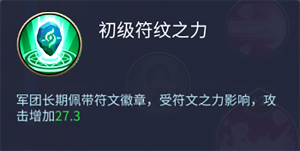 初级符纹之力:军团长期佩戴符文徽章,受符文之力影响,攻击增加27.3