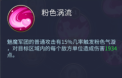 粉色涡流:魅魔军团的普通攻击有15%几率触发粉色气漩,对目标区域内的每个地方单位造成伤害1934点。