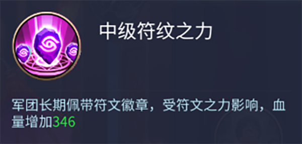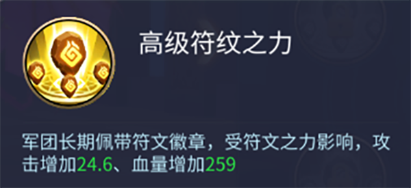 中级符纹之力:军团长期佩戴符文徽章,受符文之力影响,攻击增加24.6、血量增加259