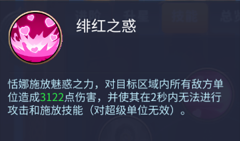 绯红之惑:恬娜释放魅惑之力,对目标区域内所有敌方单位造成3122点伤害,并使其在2秒呢无法进行攻击和释放技能(对超级单位无效)