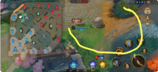 然后是游戏里提到的保证发育的同时支援边路,对面比你游的快,及时发信号,推完线去支援,最好是和打野一起游走,单独游走如果被对面打野蹲到很伤。尽量不要越过河道中线(黄色线),支援后要回到线上,如果不确定对面中野位置,选择从橙色线回到线上。
