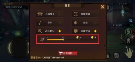 4.点击画面右上角 齿轮状图标 进入游戏设置,可以关闭/开启自动战斗以及对音效等进行设置。另外界面下方可设置游戏速度,可以选择最大4倍速进行游戏(效果非常鬼畜)
