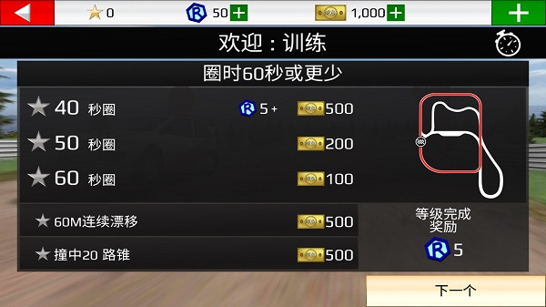 如果60秒内连续漂移则可以额外获得一颗星星和500积分的奖励;或者你也可以撞中20路锥完成以上奖励。