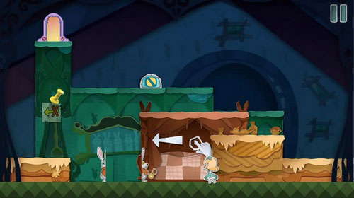 1、如下图所示移动方块,将扑克兵卡在屏幕另外一侧,然后拉下拉杆打开时钟塔的门。