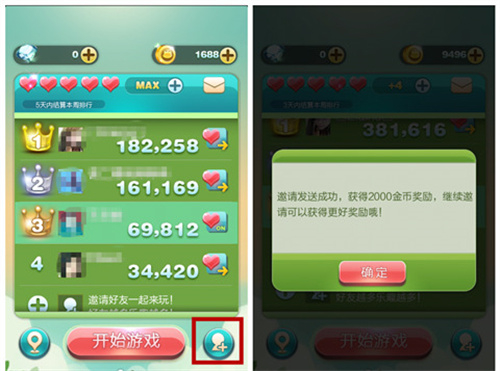 在排行界面中,点击右下角的邀请按钮(图中已用红框标出),即可邀请好友可以获得金币奖励。