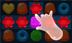 交换相邻两个糖果的位置,使4个颜色相同的糖果在同一行或同一列上连成直线,会在交换点处形成一个特殊效果。再次在该特殊效果上进行消除会消除掉一整行或者一整列的糖果。