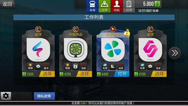 3、选择自己想要接受的工作就可以进入驾驶了,每一种工作的金额奖励都不相同,驾驶任务也各有特色,每一任务下方不仅会显示当前的奖励金额,同时还会显示运输时的天气状况以及预计耗时。