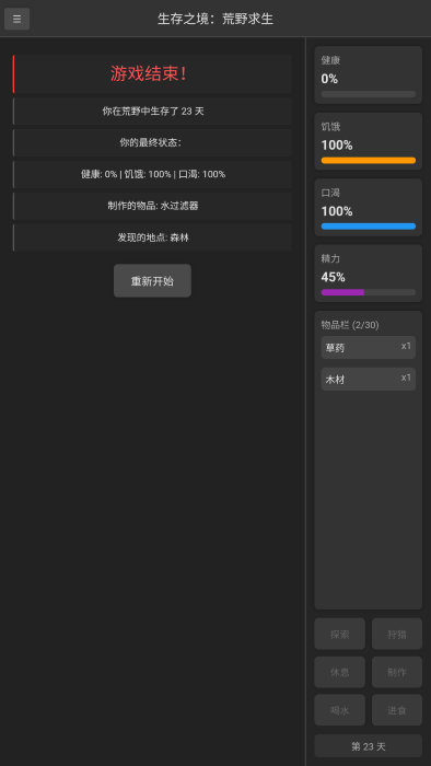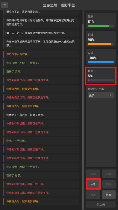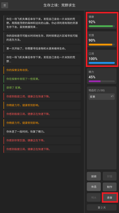 《生存之境:荒野求生》是一款文字冒险游戏。游戏中,当前状况会以文字形式呈现,各类事件也在此发生。界面右上方为人物的状态栏,下方则是基本操作区域。