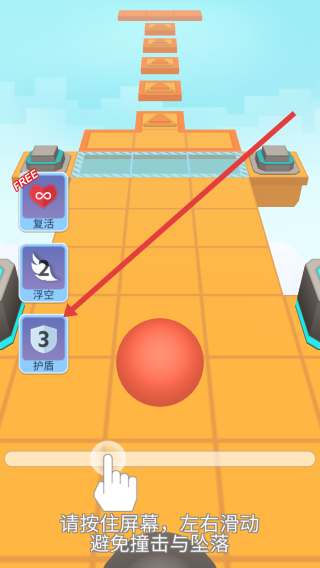 3、重新进入关卡后,可选择左侧护盾技能剩余3次,按住屏幕左右滑动,控制球体躲避危险。