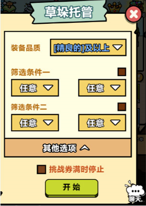 点击进入后,我们将会看到如下界面,这便是草垛托管的界面。在此界面中,我们需要重点关注的是装备品质以及当挑战卷达到上限时的停止机制。