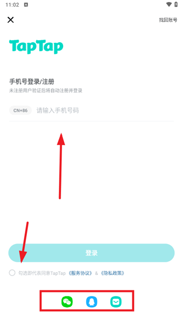 3、输入手机号,还可以使用微信,QQ和邮箱登录,记得点击同意用户协议和隐私政策