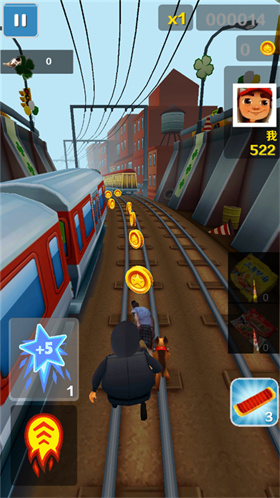 1、操作:目标是尽可能跑的远,同时还要尽可能多的收集铁轨上的金币,游戏的视角是面向角色前进的方向