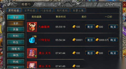 爆出的装备和道具多,留着占据背包和仓库,真是幸福的烦恼。如何有效利用不浪费呢?快来拍卖行,在这里,可以拍到各种各样的装备,材料,转生需要的道具,技能书,神饰,特戒,神器,魂器。有行会的兄弟还可在“行会拍卖”中,竞价特殊活动BOSS产出的稀有道具。