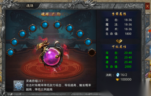 升级魂珠等级可以提升的效果有:攻击,魔法,道术和生命值。需要消耗魂珠精髓和元宝。