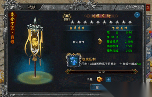 升级战旗可提升属性攻击,生命值,暴击抵抗,防御加成和魔防加成。
