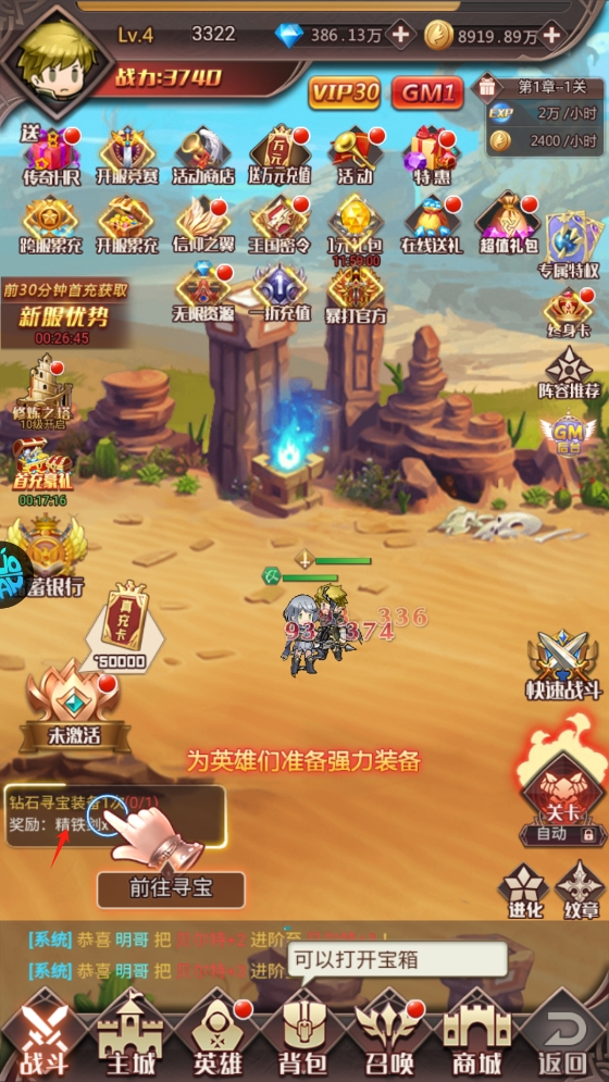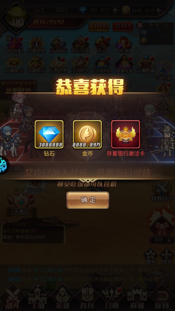 2、登录游戏即可领取钻石、金币以及激活卡,这些初始资源将为你的战斗提供有力支持。
