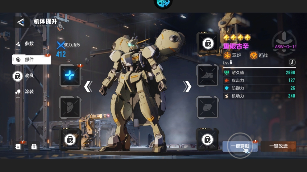 5、战斗结束后,可对获得的机体进行提升,通过等级提升、部件强化等方式增强战力,为后续挑战做好准备。