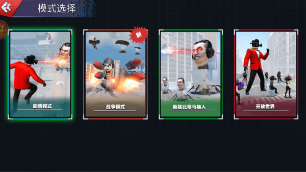 2、游戏一共有四大模式,剧情模式、战争模式、斯基比蒂马桶人、开放世界随你选择。