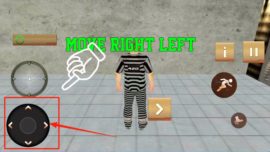 4、进入游戏操作界面,左下角的摇杆用于控制角色移动,右边有跑步和蹲下按钮。在游戏过程中,注意避开警察的视线,巧妙躲避追捕。