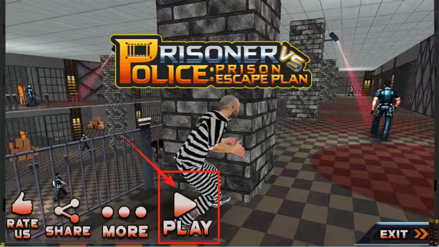 值得一提的是,游戏的道具互动系统极具特色,它支持玩家进行创造性的道具组合,一些看似普通的日常物品,在玩家的巧思之下,能够被改造成具备多种功能的实用工具,助力玩家成功越狱。1. 来到游戏主界面后,点击橙色的“PLAY”按钮,即可开启游戏。在该界面里,“RATE”代表评分功能,“SHARE”用于进行分享操作,点击“MORE”能够查看更多游戏,而“EXIT”的作用是退出游戏。