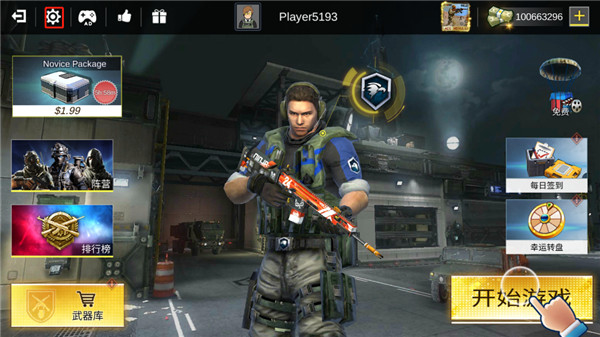 1. 打开游戏,进入首页后,能看到有阵营、排行榜、武器库等功能板块,此时可先点击齿轮形状的设置键。
