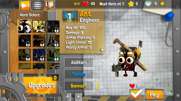 3、每个小关过去之后都可以获得一枚金币和升级经验值,金币的作用是可以在选英雄的界面升级能力,这个我们都很熟悉,和《王国保卫战》里面一样,在主动、被动、功能和炮塔进行能力的解锁和升级;经验值的累积则是可以升级英雄的等级。