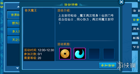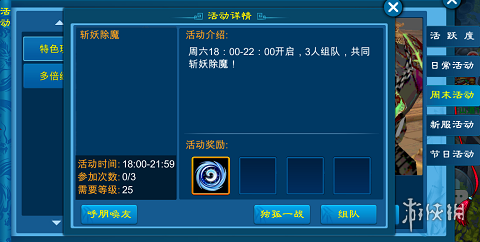 斩妖除魔:周六18:00-22:00开放,3人组队进行斩妖除魔。活动奖励大量灵气,是获取极品装备的重要途径。
