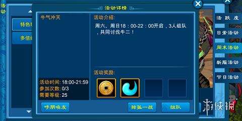 牛气冲天:周六、周日18:00-22:00开放,3人组队挑战牛二。成功击败后可获得大量铜钱和真气,是发家致富的好机会。