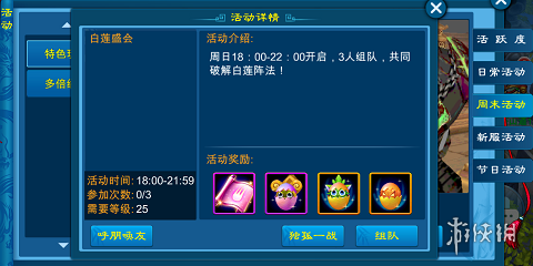 白莲盛会:每周日18:00-22:00开放,需3人组队参与,共同白莲阵法。活动奖励包括极品仙宠、灵南仙果以及天赋仙书4阶卷轴等珍贵物品。