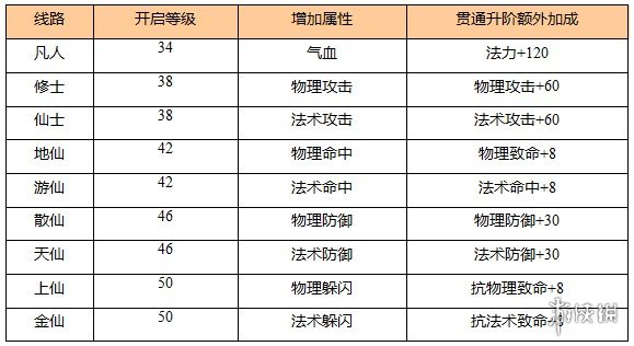 属性加成:每条修仙线路开启等级不同,所增加的属性也不相同