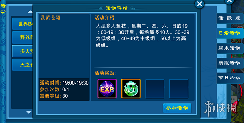 乱舞苍穹:每周二、四、六开放,满10人即可开战。享受无阵营限制的群体大乱斗,这里强者未必能主宰一切,弱者也有机会偷袭成功。活动奖励包括海量经验和荣誉。