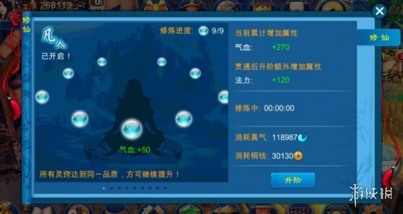 升阶条件:每条修仙线路均需修炼满后才可进行升阶,升级消耗真气和铜币;升阶紫色和橙色灵窍还需消耗指定道具【千年神水】