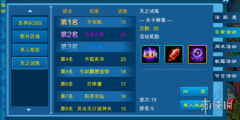 多倍经验:周六、周日18:00-22:00期间,参与乱舞苍穹、百鬼夜行、野外副本、探宝副本均可享受双倍经验加成,千万不要错过。