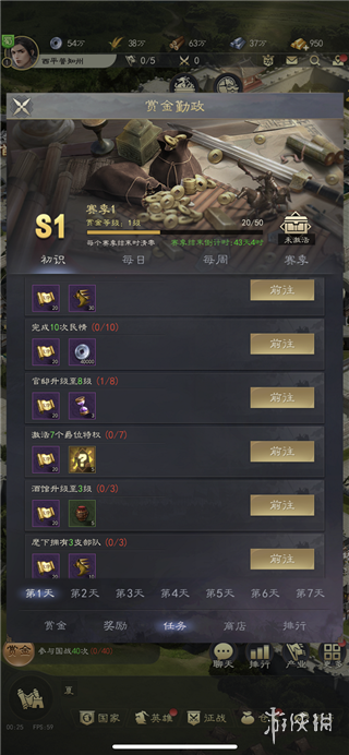 6、赏金任务包括初识、每日、每周、赛季任务以及未来的密旨任务。完成每日任务可以获得活跃度,当活跃度达到一定值时,可以获得活跃奖励(其中政绩奖励非常重要,可以解锁更多功能)。