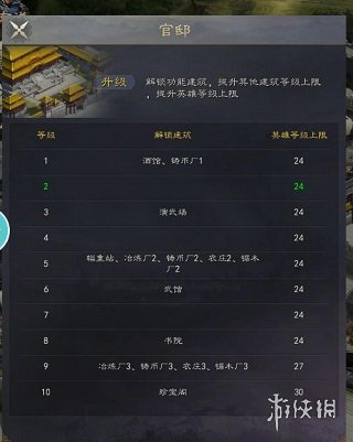 2、此外,达到一定的官邸等级还可以解锁新的玩法。因此,推荐玩家在游戏前期主要升级官邸,以便更快开启新的游戏内容。