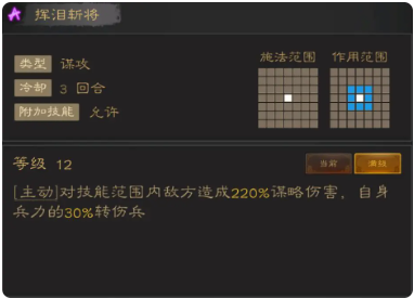 高倍率谋略AOE,伤兵本身没啥太大影响,最大的缺陷在于范围太小,最好配合高移动力的谋略将使用。一般情况都是诸葛带,放完再动后上去压点血线。