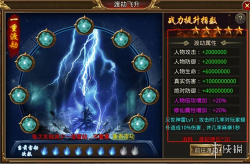 在游戏中玩家可以通过渡劫飞升来提升人物属性,游戏共设置了十重渡劫挑战,每重渡劫都需要经历九道雷劫。