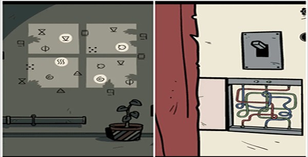 10、往右转,点击窗户将窗帘拉上,接着戴上手套完成右边的线路拼图,然后打开上方的开关。紧接着移步到标有叉号的门处,把开关装在房间电灯的电源线上,关闭灯光后注意墙上的提示。